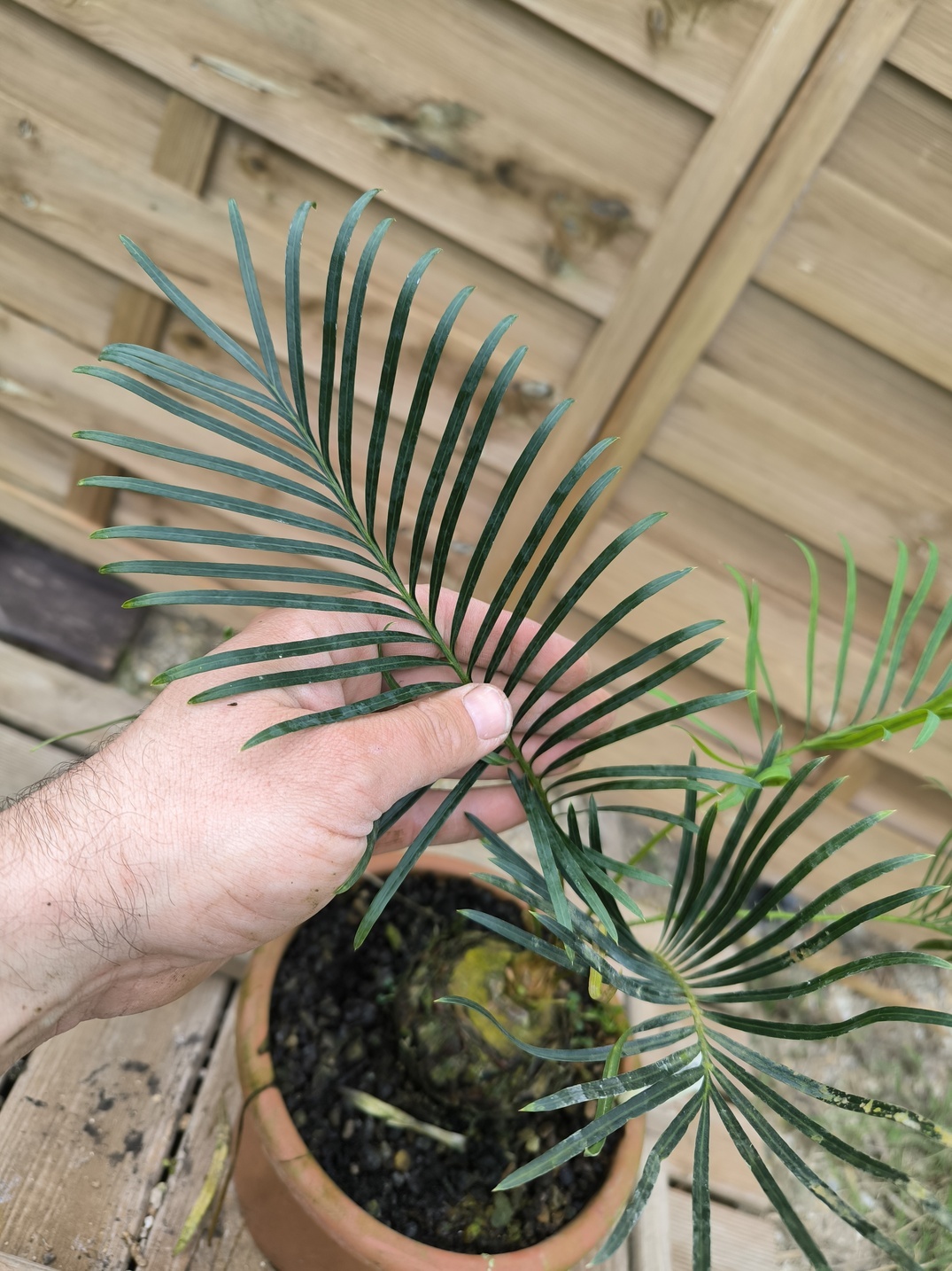 The drawbacks of grafting: The revoluta roostock tends to make offsets that have to be cut quite frequently. Unfortunately, the rootsock doesn’t transmit its cold resistance to the blue Cycas, so it has to be kept frost free. Cycas revoluta is very hungry for iron, so it should be given iron chelate or blood meal at least twice a year.